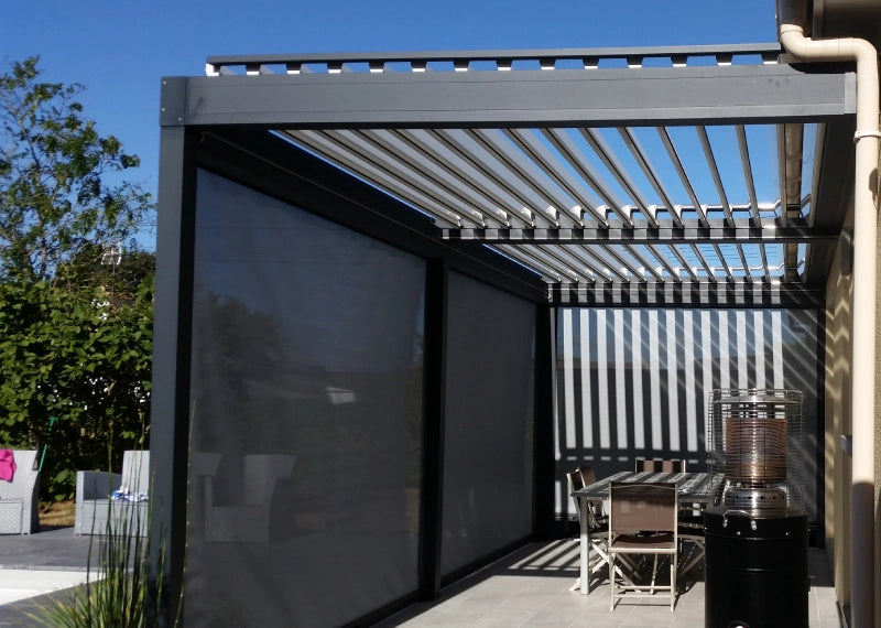 Libre à vous d'y ajouter des baies coulissantes en aluminium : voici une véritable véranda bioclimatique sous laquelle vous maitrisez la température pour passer de l'intérieur au dehors sans soucis même en plein été.
